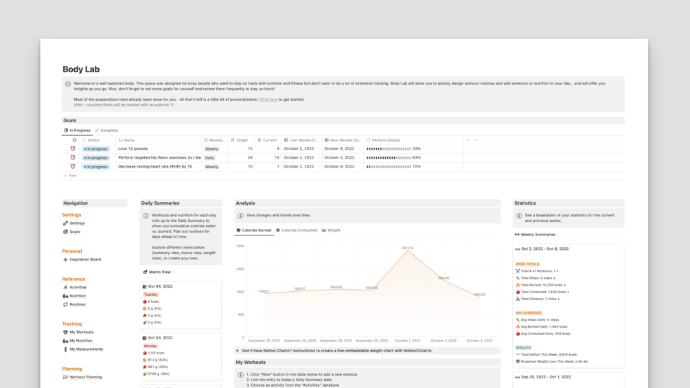 You'll receive the fully integrated and dynamic "Body Lab" fitness and nutrition system to duplicate into your own Notion workspace. You'll also receive a demo version, complete with example content.