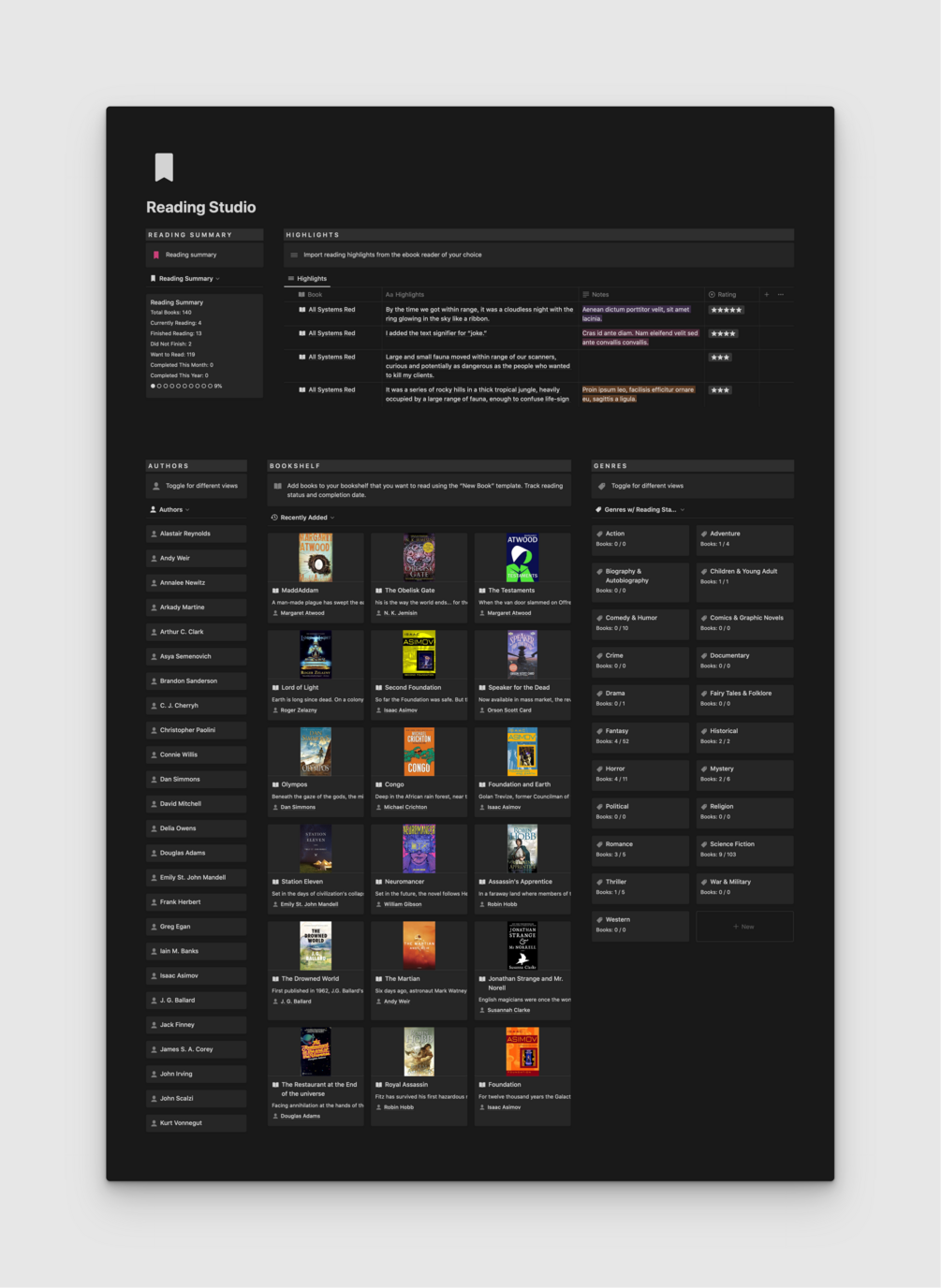You’ll receive the “Nook Reading Studio” bookshelf & reading management system to duplicate into your own Notion workspace. You’ll also receive a demo version, complete with example content. Includes complete support documentation and getting started guide.