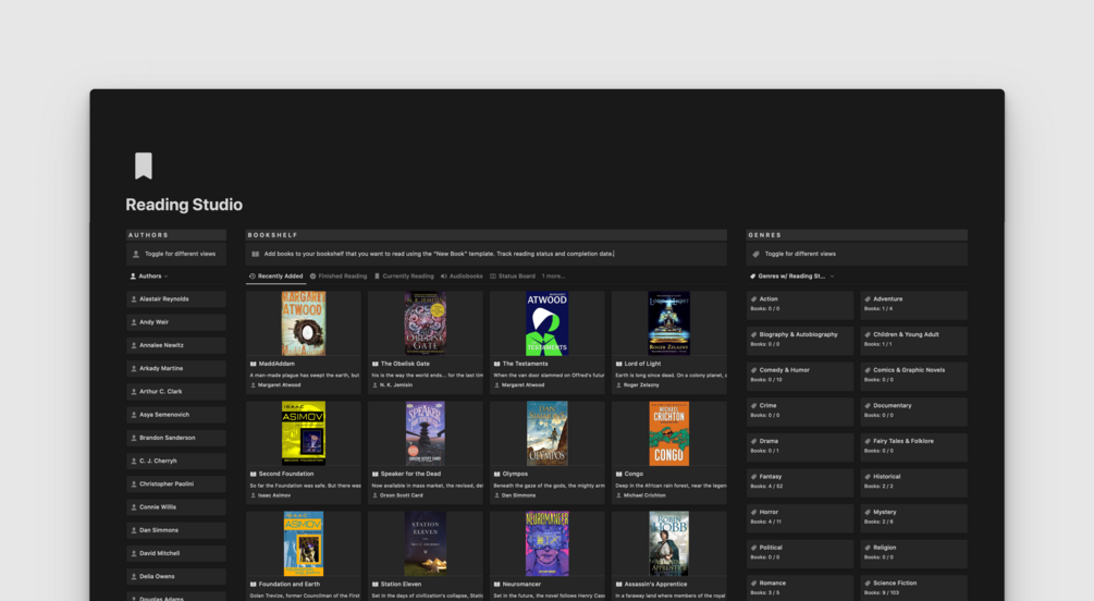 You’ll receive the “Nook Reading Studio” bookshelf & reading management system to duplicate into your own Notion workspace. You’ll also receive a demo version, complete with example content. Includes complete support documentation and getting started guide.