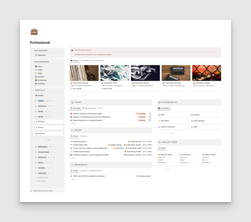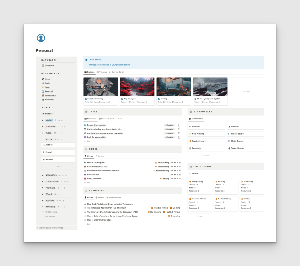 Keywords: second brain, life os, project management, agile, collections, expandables, portals, goals, OKRs, schedule, time blocking, recurring tasks, focus dashboards