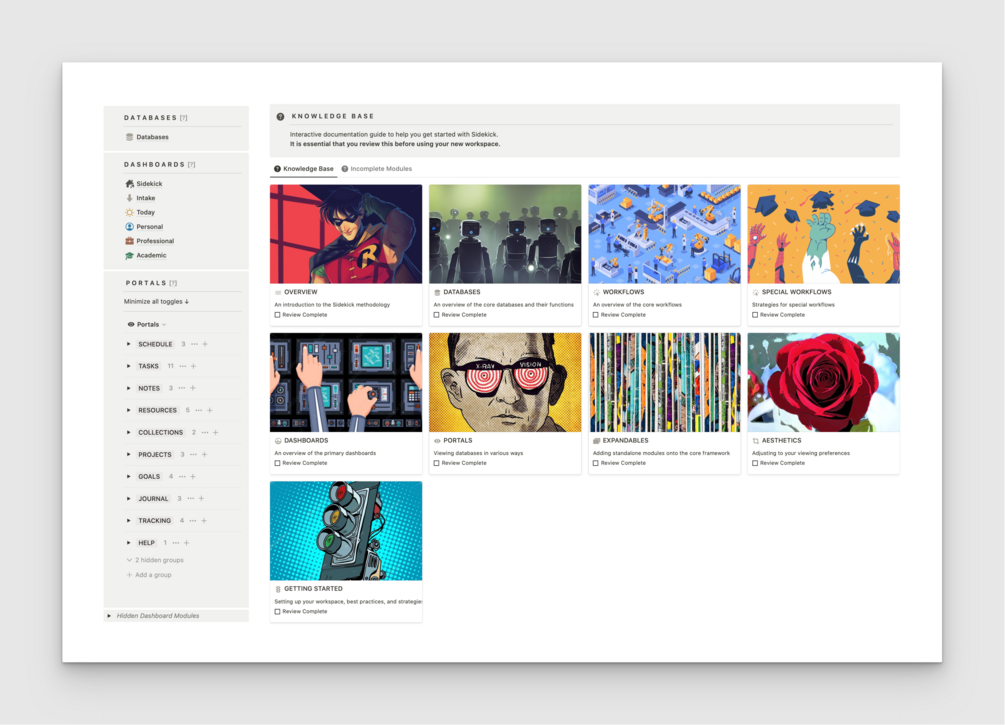 You’ll receive the “Sidekick” Domains of Life Management System plus two bonus Expandables to duplicate into your own Notion workspace. You’ll also receive a demo version of the system, complete with example content. Sidekick includes a built-in interactive knowledge base that will help you to configure your new workspace.