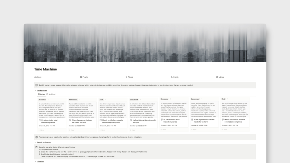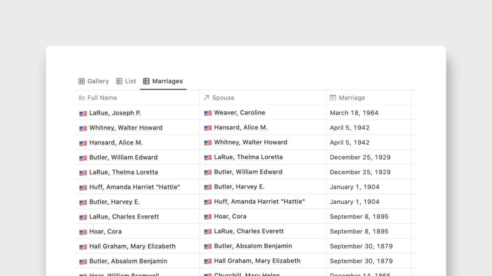 Power your genealogy research with Notion. Track your entire family history and all of the threaded connections between people, places, stories, and events. View when people lived and died on a timeline, and see which people were alive at the same time. Watch family migrations across various regions.