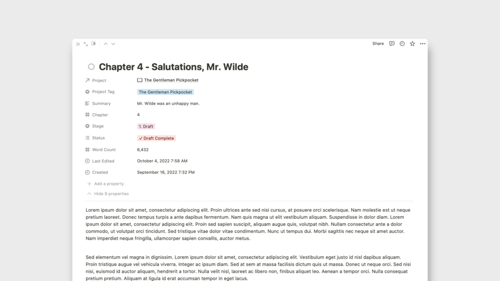You'll receive the minimalist "Writer" distraction-free story-writing workspace to duplicate into your own Notion workspace. You'll also receive a demo version, complete with example content.