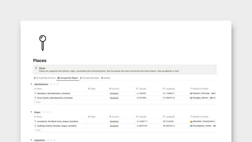 Power your genealogy research with Notion. Track your entire family history and all of the threaded connections between people, places, stories, and events. View when people lived and died on a timeline, and see which people were alive at the same time. Watch family migrations across various regions.