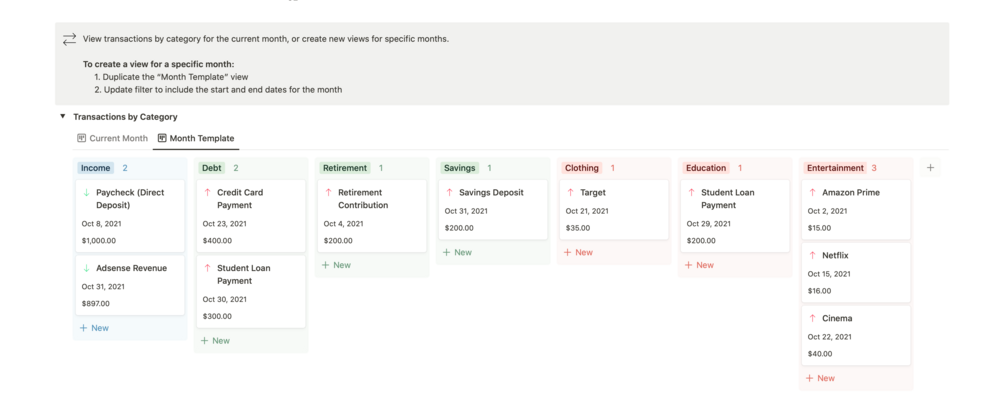 - Keep track of transactions for money going out. The total amount spent by category will roll up into the monthly summary for analysis to see if you stayed within budget