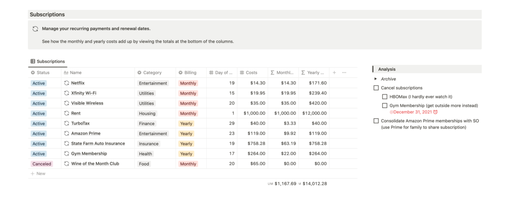 - Manage your recurring payments (subscriptions) and renewal dates. Monthly and yearly aggregate costs will be calculated for you so you can see how your subscriptions add up