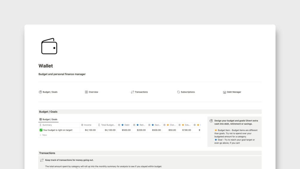 You'll receive the complete "Wallet" budget and personal finance manager to duplicate into your own Notion workspace. You'll also receive a demo version, complete with example content.